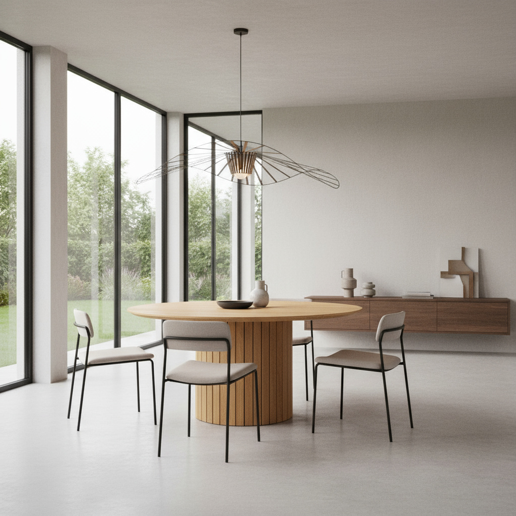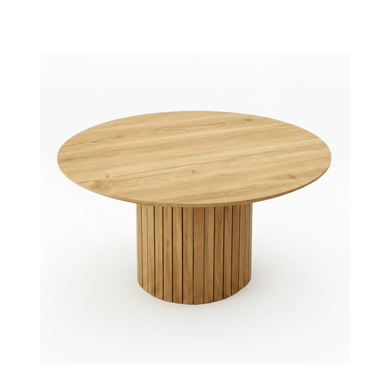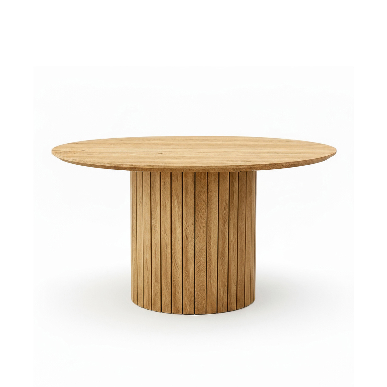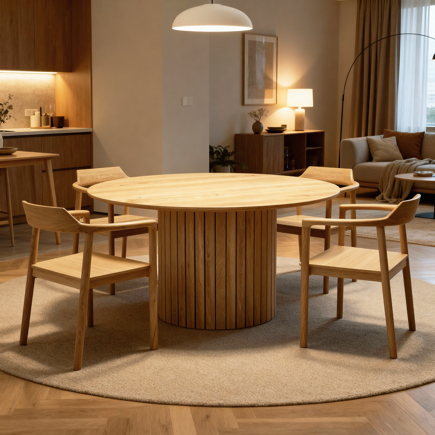 100% Masiven Hrast. Okrogla jedilna površina spodbuja pogovor, izničuje hierarhijo sedenja in omogoča enostaven pretok okoli mize – idealno za družinske obroke in druženja s prijatelji. Izbirate lahko med hrast čisto (brez grč (na sliki)), hrast blagi rustik (vmes med čisto in rustik – malo grčasto) in hrast rustik (grče). Za premaz imate na voljo mat lak ali olje. Olje za mize odsvetujemo in vam svetujemo, da izberete mat lak. Model: M-1501O Krog